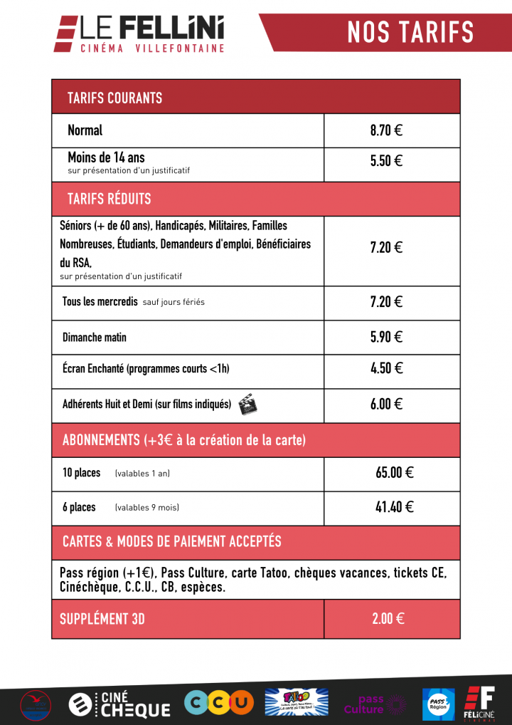 Nous aurions aussi pu ajouter les séance "événements" (6€), la réduction pour les adhérents de l'ASVF Omnisport (6,50€ pour les adultes, 4,50€ pour les enfants), etc. Mais vous l'aurez compris : ça ne coûte pas plus cher de venir voir un film au Fellini.